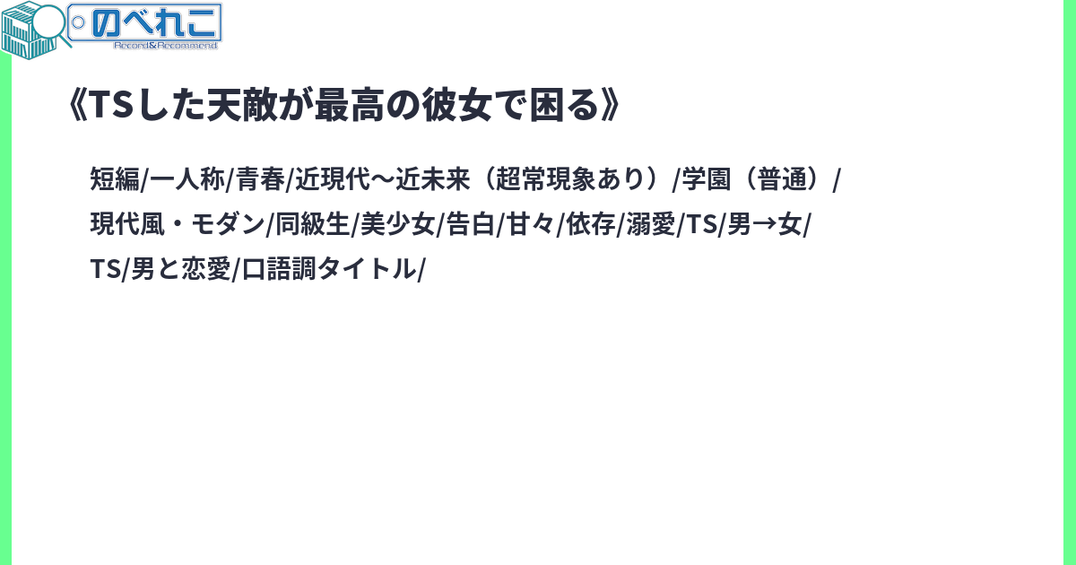 堀之内辰美は俺の天敵である。コイツには敵わないと何度も思わされてきた。眉目秀麗、学業優秀、スポーツ万能、嫌味の無い性格で多趣味、誰からも好かれる人気者。そんなアイツが、ある日突然……女になった。しかも凄くかわいい、さらに滅茶苦茶ぐいぐい来る。一体俺はどうすればいいんだ。サイトタグ:性転換 幼馴染 青春 甘々 デレデレ 溺愛 依存 美少女