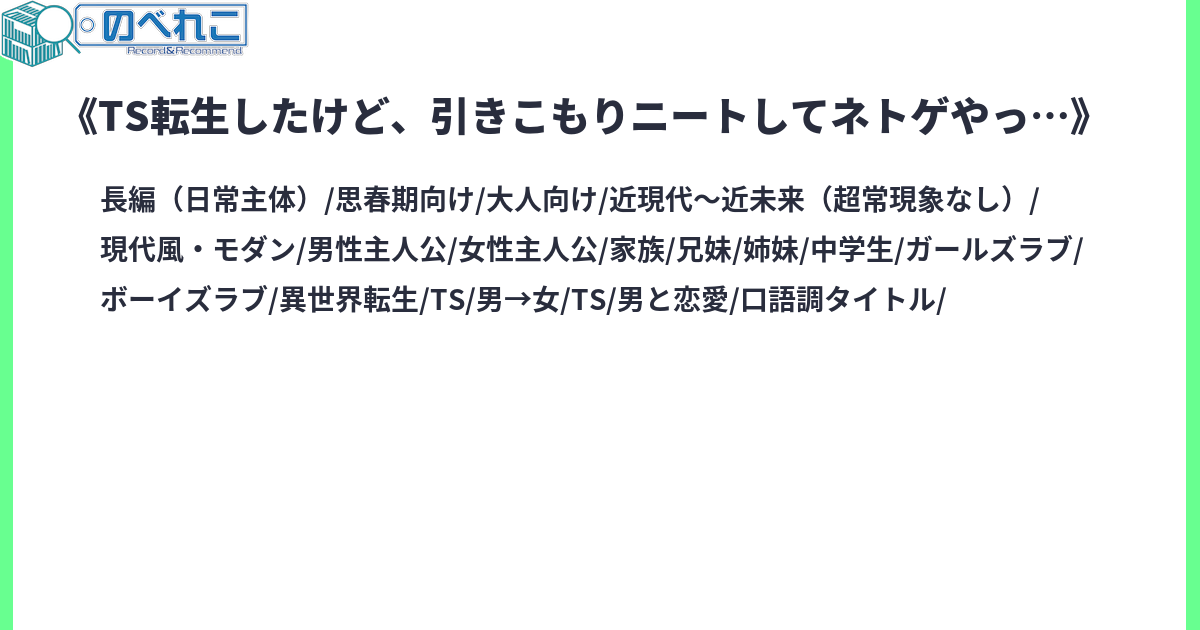転生して女として生まれ変わった元男、葉風 深沙季(はかぜ みさき)。2週目人生をさあ謳歌しようとしたのはいいものの、孤立し、いじめられ、さらには男に襲われかけ………。深沙季はついに精神を病み、引きこもってしまう。双子の妹に心配されながらも、中々部屋から出る勇気が出ず、ずっと部屋でMMOをプレイし続ける深沙季。そんな深沙季の元へやってきたのは、母親の再婚相手の息子で………?男性恐怖症のTS娘が、義理の兄と関わりながら、少しずつ前向きになっていくお話。※タグは追加する可能性があります。ご了承ください。※『小説家になろう』様にも投稿しています。サイトタグ:現代 日常 TS かわいそう 散々 精神的BL 女主人公 男主人公 R-15 ボーイズラブ ガールズラブ オリ主 転生 性転換