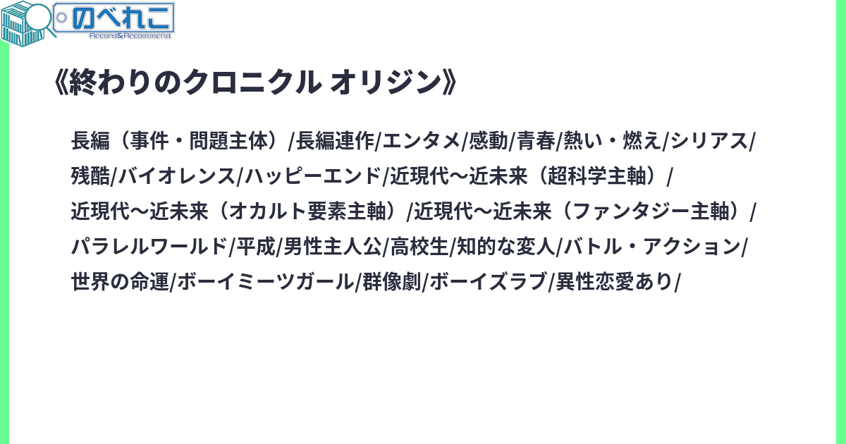 「今こそ言おう。……佐山の姓は悪役を任ずると!」「―――Tes.(テスタメント)」 川上 稔が贈る大人気シリーズ『終わりのクロニクル』が、カクヨムネクストにてアイコントーク形式で連載開始! 連載にあたり、紙書籍版の原稿からアイコントーク形式にフォーマットを変更。加筆修正による全面リライト! 加えて、キャラクターデザインもさとやす氏によるリデザインが入ります。 初めて『終わりのクロニクル』を読む方も、すでに読んだことのある方も、装いも新たに紡がれる壮大な戦後交渉の物語にご期待ください!◆あらすじ かつて世界は、平行して存在する10個の異世界と戦闘を繰り広げていた。 概念戦争と呼ばれるその戦争に勝利してから60年。全てが隠蔽され、一般の人々に知られることなく時が過ぎた現在……。 高校生の佐山御言は祖父の死後、突然巨大企業IAIより呼び出しを受ける。 そして、この世界がマイナス概念の加速により滅びの方向へ進みつつあること。それを防ぐには、各異世界の生き残り達と交渉し、彼らが持つ10個の概念を解放しなければならないことを伝えられる。 かくして、佐山は多くの遺恨を残した概念戦争の戦後処理として、最後の闘いに巻き込まれていくが……。※毎週月~金(土日を除く、週5日毎日12:00更新予定)※最新3話分のエピソードを読むには、有料サービスであるカクヨムネクストへの加入が必要となります。サイトタグ:電撃文庫 川上稔 AHEADシリーズ 終わりのクロニクル