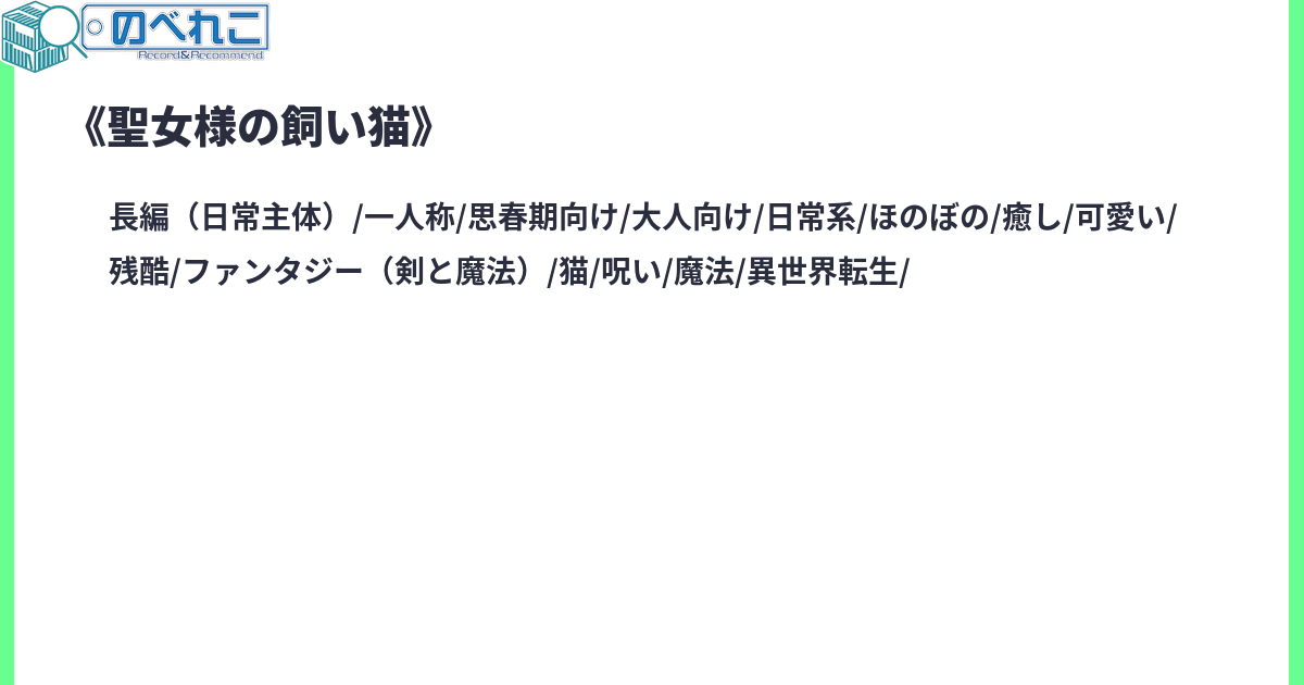 サイトタグ:ファンタジー 日常 猫 聖女 もふもふ ほのぼの R-15 残酷な描写 転生