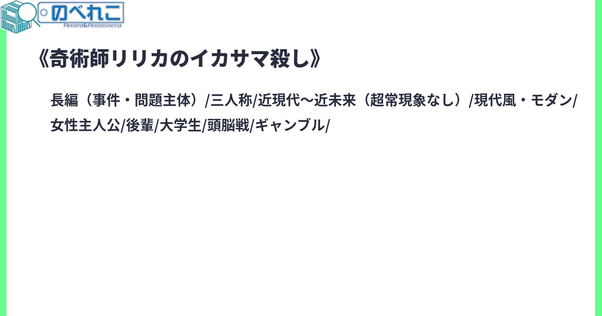 恭帝大学ポーカー研究会の霞ヶ丘塔矢の元に舞い込んだ、ポーカー賭博の被害相談。 イカサマによって被害者たちが大金を巻き上げられていることを知った塔矢は、イカサマの正体を探るため、マジックが得意な女子大生、竜胆莉々花に相談を持ちかける。 果たして、塔矢と莉々花はイカサマポーカーを攻略できるのか。 さあさあ、皆様お立ち会い。 これよりご覧に入れますは、ペテンが飛び交う奇術舞台。 奇術師リリカによるイカサマ殺し。 平等に確からしい確率を捻じ曲げる不届き者を、奇術の刃で公正公平に討ち取ってご覧に入れましょう。サイトタグ:マジック 手品 奇術 ポーカー ギャンブル