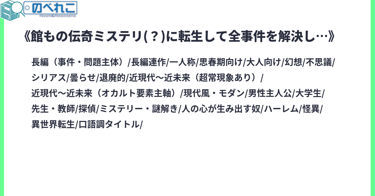※現在第3部プロット作成中。 ──────────────── 館もの伝奇ミステリに転生しました。 冴木ハクア。 二十一歳、大学生です。 全事件を解決しました。 爆乳美女七人に告白されました。 師匠であるノートPC(憑藻神)が言うんです。[まずはひとつひとつの事件を、振り返ってみるべきだ] ……彼女たちの気持ちが、とても重いことが分かりました。 あと、この館なにかおかしい。サイトタグ:現代 ミステリー ハーレム 怪異 妖怪 都市伝説 民間伝承 憑藻神 爆乳 官能 淫靡 性癖 倒錯 エロ 激重感情 後日談 架空原作 物語 伝奇 湿度 恋愛 発情 依存 執着 ♥ インモラル・バケ・モノガタリ R-15 転生
