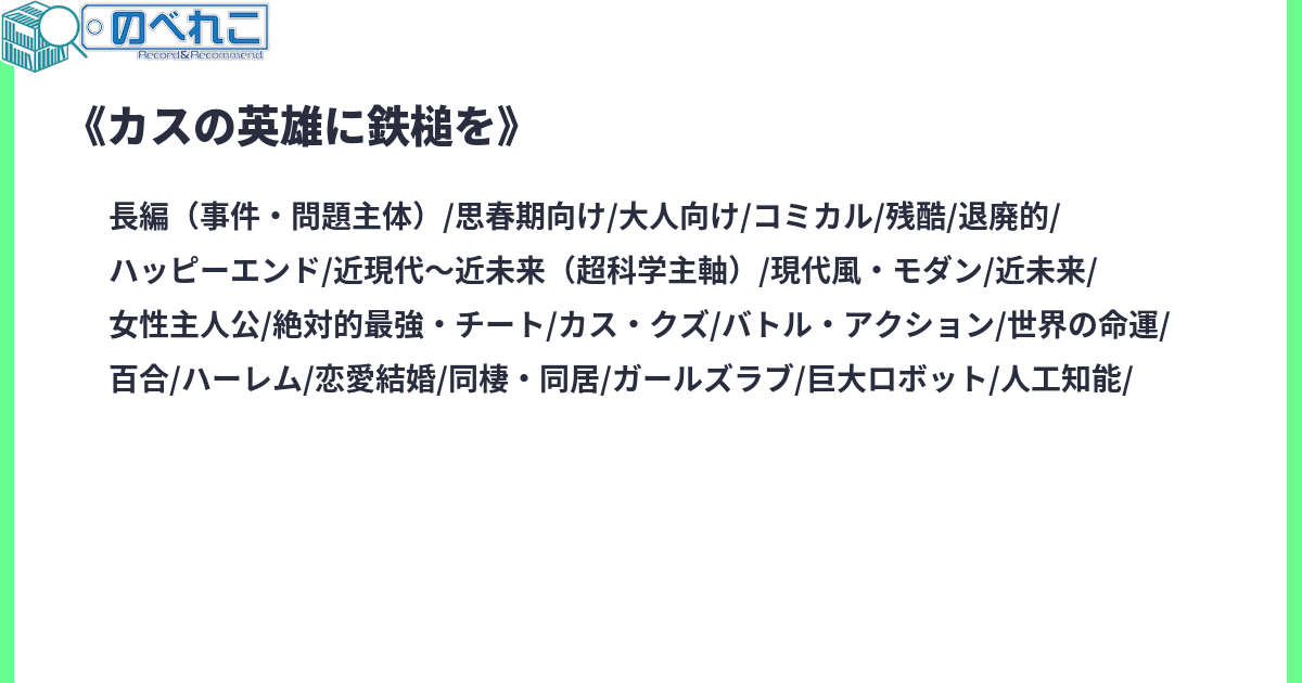 「ここは私に任せて先に行け!」と、身を挺して仲間を逃がし生死不明になった主人公。悲しみに暮れる仲間たちは主人公が残した映像メッセージを見つけ、その中で明かされる衝撃の真実に打ちひしがれるのだった。ロボバトル要素のある百合コメディ。サイトタグ:SF 冒険・バトル 女主人公 百合 巨大ロボ ハーレム R-15 ガールズラブ 残酷な描写