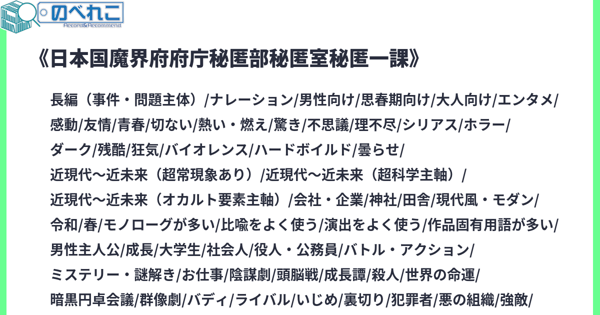 | バトル・アクション | ミステリー・謎解き | お仕事 | 陰謀劇 | 頭脳戦 | 成長譚 | 殺人 | 世界の命運 |