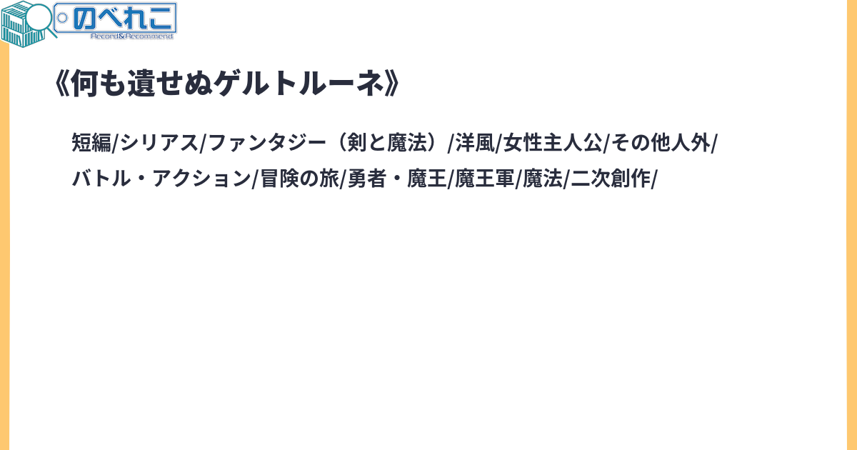 その魔族は功績もなく名もなく何も遺せぬまま塵と消えた。過去を語らず報酬も求めずただ人間を嫌い魔族を憎んだ魔族ゲルトルーネ。それは『葬送のフリーレン』の隙間にあったかも知れない物語。サイトタグ:葬送のフリーレン フリーレンにコロコロされる魔族オリ主杯 オリ主