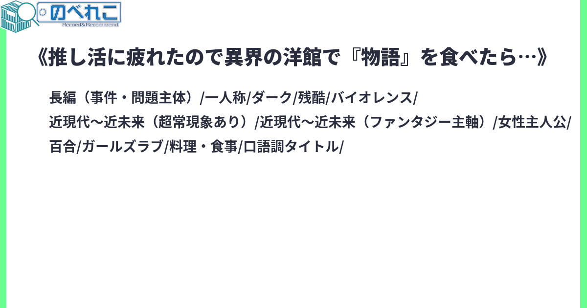 心も財布も時間も、「推し」に全てを捧げてきた私。なのに。推しが……いなくなった。空っぽになった灰色の私。迷い込んだ霧の洋館で待っていたのは、二人の美しい人形メイドだった。「ようこそ、ドール館へ。ここでは『物語』が食材でございます」前菜は『追放令嬢の復讐』のスパークリング。スープは『竜の溺愛』を煮込んだコンソメ。メインは『神への生贄』の和風鮮血ステーキ――。提供されるのは誰かによって紡がれた、愛と狂気、そして執着の物語。それらを咀嚼し飲み干すたび、私の身体は熱を帯び、変質していく。ただの推し活、遠く見守る観客だったはずの私が、色鮮やかな『怪物』へと生まれ変わるために。これは、空っぽの少女が八つの物語を捕食し、世界を魅了する「推される側」へと覚醒する、極上の美食ファンタジー。※本作は完全に独立した1作品としての長編小説ですが、作中で提供される『料理(物語)』は、同時連載の短編小説とリンクしています。あわせて読むことで、より深い味わいをお楽しみいただけます。※メニューのイメージ映像を近況ノートに公開しています。(作中前書きにリンクをお知らせしてあります)<出版者様/編集者様/審査員様向け注釈>※AI補助利用タグに示す、使用した内容と注記・メニュー画像の生成 (使用AI=Nano banana 3.0 Pro+Photoshop) 使用理由:特別企画として読者様にお楽しみいただくための画像をご用意するため。 出版社様への指示プロンプト提出、.PSDファイル提出:可・誤字、脱字チェック等、執筆後の原稿の校正作業補助 (使用AI=Gemini3.0) 使用理由:企画、構想後本作の執筆を一度断念。11月末に本作の執筆再稼働。このため自力校正のみでの、12月1日公開開始に向けた原稿品質維持に差しさわりが生じたため、緊急的に使用。 出版社様への指示プロンプト提出:可サイトタグ:飯テロ ダークメルヘン 百合 ダークファンタジー 狂気 劇薬 ハッピーエンド AI補助利用