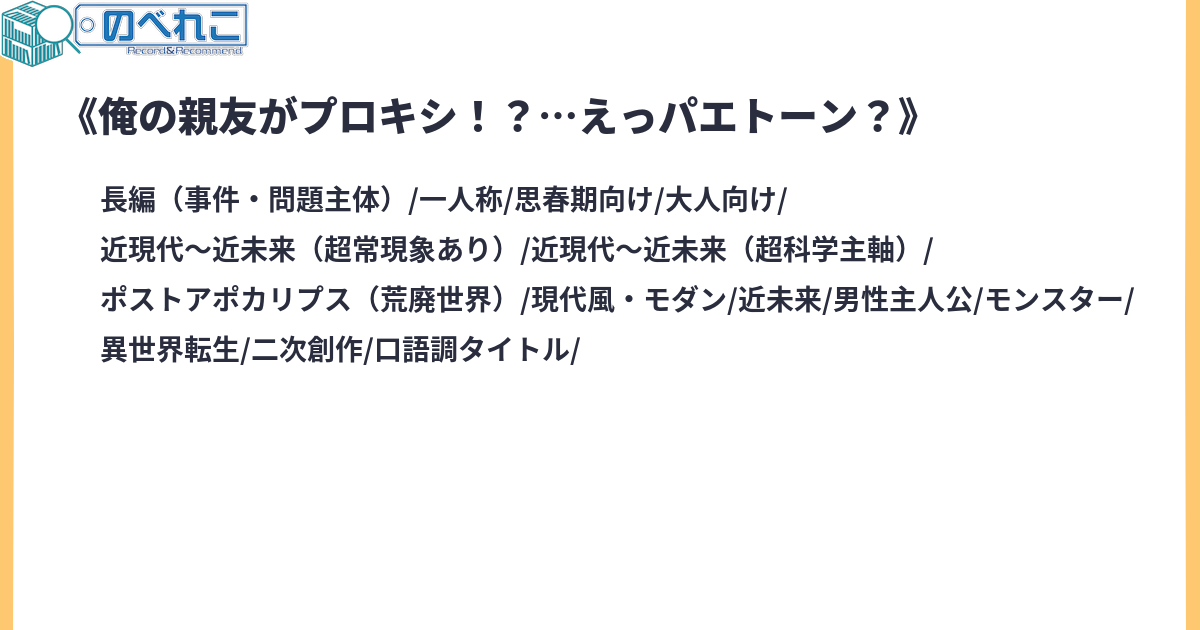 | 近現代〜近未来(超常現象あり) | 近現代〜近未来(超科学主軸) | ポストアポカリプス(荒廃世界) |