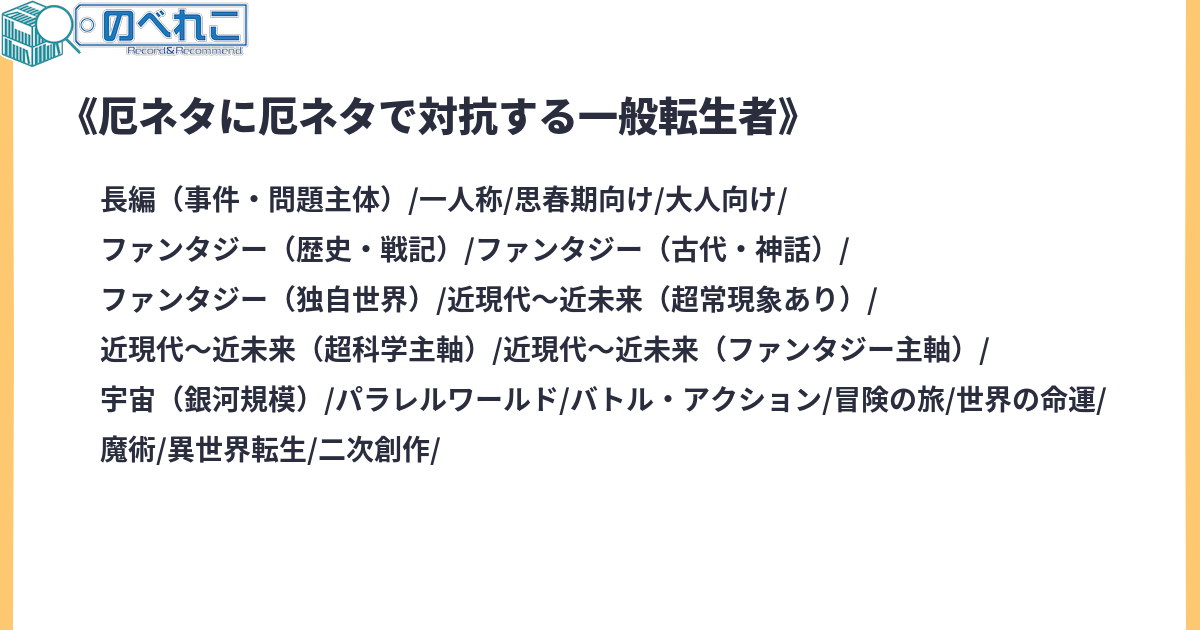 | ファンタジー(歴史・戦記) | ファンタジー(古代・神話) | ファンタジー(独自世界) | 近現代〜近未来(超常現象あり) | 近現代〜近未来(超科学主軸) | 近現代〜近未来(ファンタジー主軸) | 宇宙(銀河規模) | パラレルワールド |