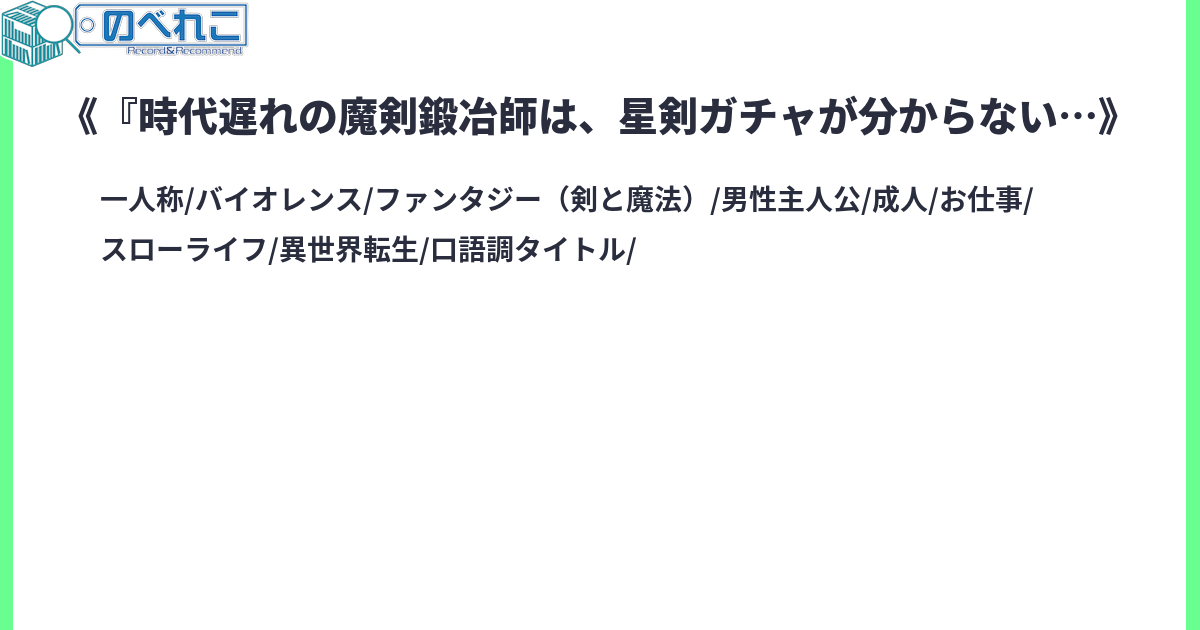 世界を滅ぼしかけた災厄「昏禍」と、星に選ばれし人類の守護者「星剣」。 昏禍の脅威に唯一対抗できる星剣の圧倒的な力によって人類は滅亡の危機を脱し、 代わりに旧時代の魔法や魔術は全て消え去りつつあった。 時は今、まさしく大星剣時代を迎えていた。 現代で唯一「魔剣」の製作技術を持つ、最後の魔剣鍛冶師"台座"のラーセルは、ひょんなことから星剣騎士候補生の少女、リュネットと出会う。 魔剣に興味を抱いたという少女は、星剣嫌いのラーセルにも臆さず、たびたび彼の工房を訪ねてくるようになる。 ラーセルはリュネットの言葉に仕方なく応えるうちに、本来なら関わるはずもなかった、大星剣時代の真実に近づいていく。○"台座"のラーセル 灰色の髪に眼帯の青年。25歳。 星剣の出現によって旧時代の遺物となった魔剣鍛冶師。星剣が嫌い。○リュネット・シンリル 桜色の髪を長く伸ばした、人懐こい微笑みの少女。16歳。 星剣学府に通う星剣騎士候補生。花と癒しを司る星剣を持つ優等生。○用語・昏禍/シェイド 異次元からの侵略者と呼ばれる謎の災厄。万物を侵蝕し怪物に変える性質を持つ。・星剣/アストラ 世界の欠片とされる"輝星石"の適合者が生み出す、魂を具現化した武器。昏禍を唯一浄化できる。○???・輝星石 昏禍と戦う意志を持つ生命と融合し、星剣の元となる神秘の石。 今ならスタートダッ■■■■■■■■■■■■■■■■■■■■■■■■■■■■■■■■購■可能。サイトタグ:ライトノベル ファンタジー 異世界転生 スローライフ お仕事 ソーシャルゲーム 成人男性×女子高生