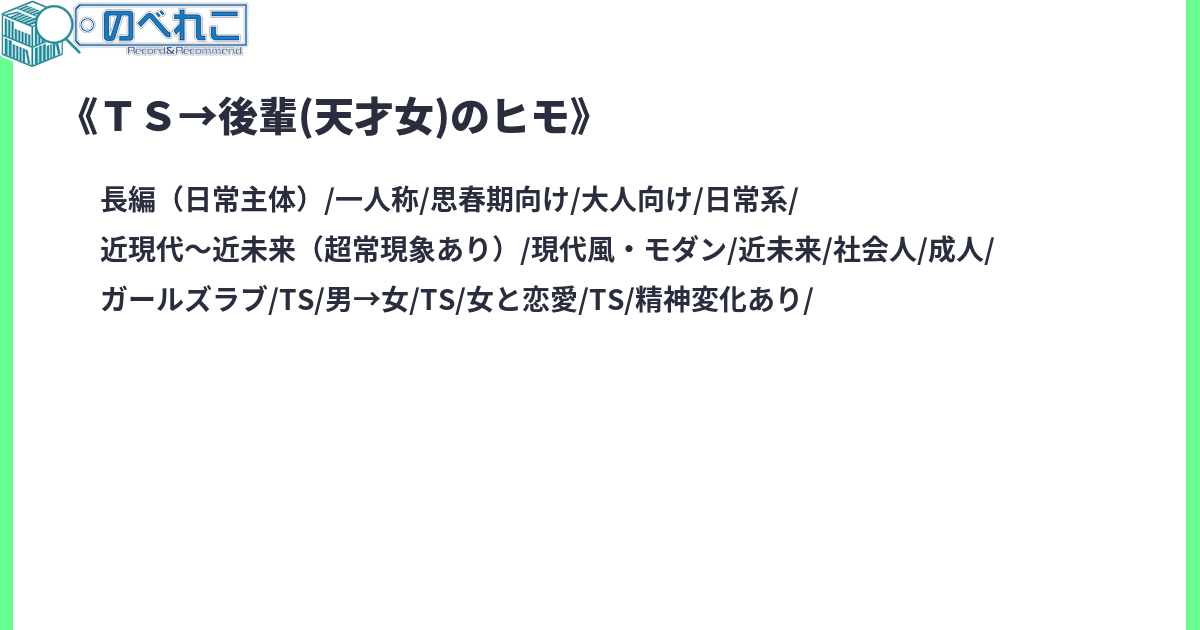 「僕を、ヒモにしてください」「……はい?」 2053年。ちょっと未来の東京、会社勤めの三十四歳の独身男性(彼女いない暦=年齢)である「英輝夜」はある日、「朝おん」をかました。一夜にして戸籍、貯蓄、住所の全てを失った輝夜が選んだのは……。 後輩の「ヒモ」だった。サイトタグ:現代 恋愛 精神的ノーマルラブ R-15 ガールズラブ 性転換
