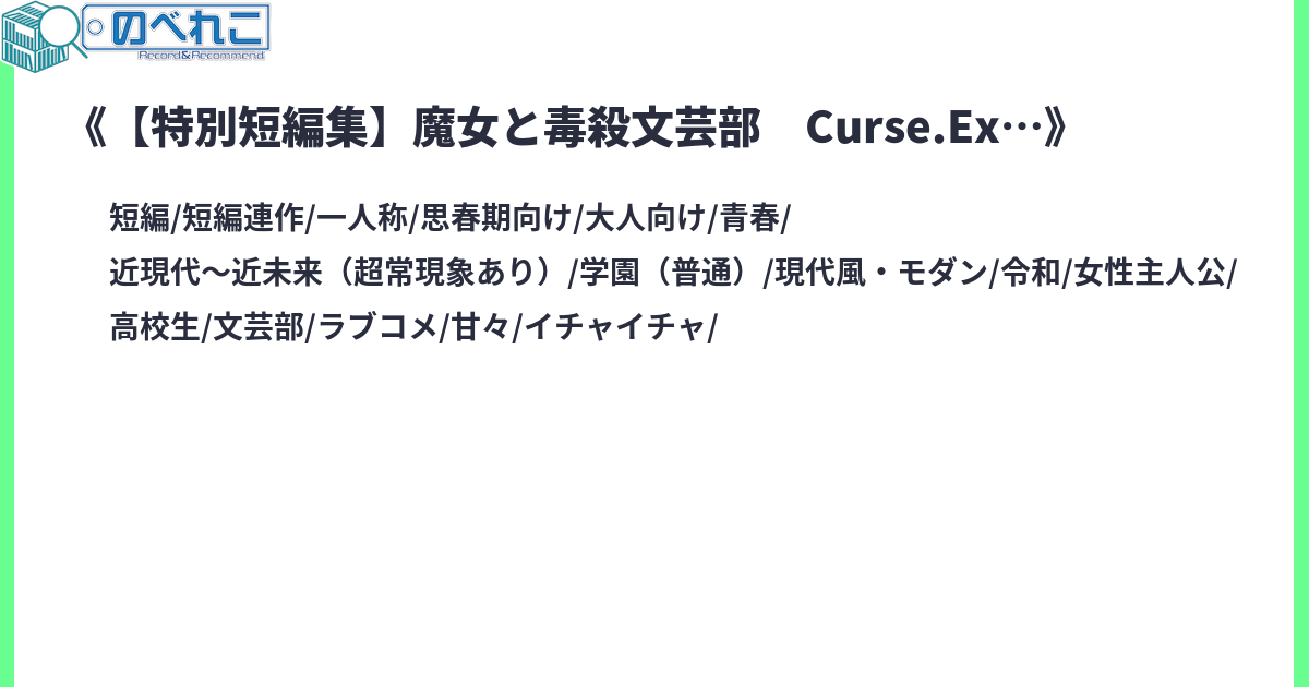 【特別短編集】魔女と毒殺文芸部 Curse.Ex 記載内容①・孤紺糖財の失態【著者書き下ろし】あらすじ①:MF文庫Jより発売中の『魔女と毒殺文芸部』に登場するヒロイン、孤紺糖財の誕生日記念ショートストーリーです。本編未読の方でも楽しめる内容となっております。※通常、他者の著作物の二次創作は禁止ですが、私は『原作者本人』であり、出版社(権利者)の許諾を得ています。なんだこのハイパーレアケースは!!商業作家が無料でSSを公開してるとは何事だ!!と思った方は走って駆け付けてください。かわいいヒロインたちが、あなたを待っていますよ。サイトタグ:R15 女主人公 ラブコメ 恋愛 日記 彼氏 激甘 イチャラブ バカップル 誕生日