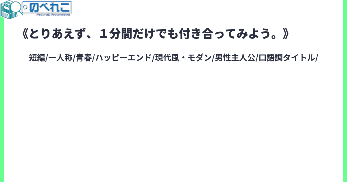 1分後に世界が滅ぶらしい。そんな状況なのに、長年の付き合いの彼女から、電話がかかってきた。「ニュースを見ればすぐ分かることだけど時間のムダね。さしあたっては、私と付き合って欲しいのよ」世界が滅びる1分前に告白をしてくる女が世界にはいるらしい。とりあえず、1分間だけでも付き合ってみることにした。サイトタグ:青春 電話 彼女 ハッピーエンド 短編