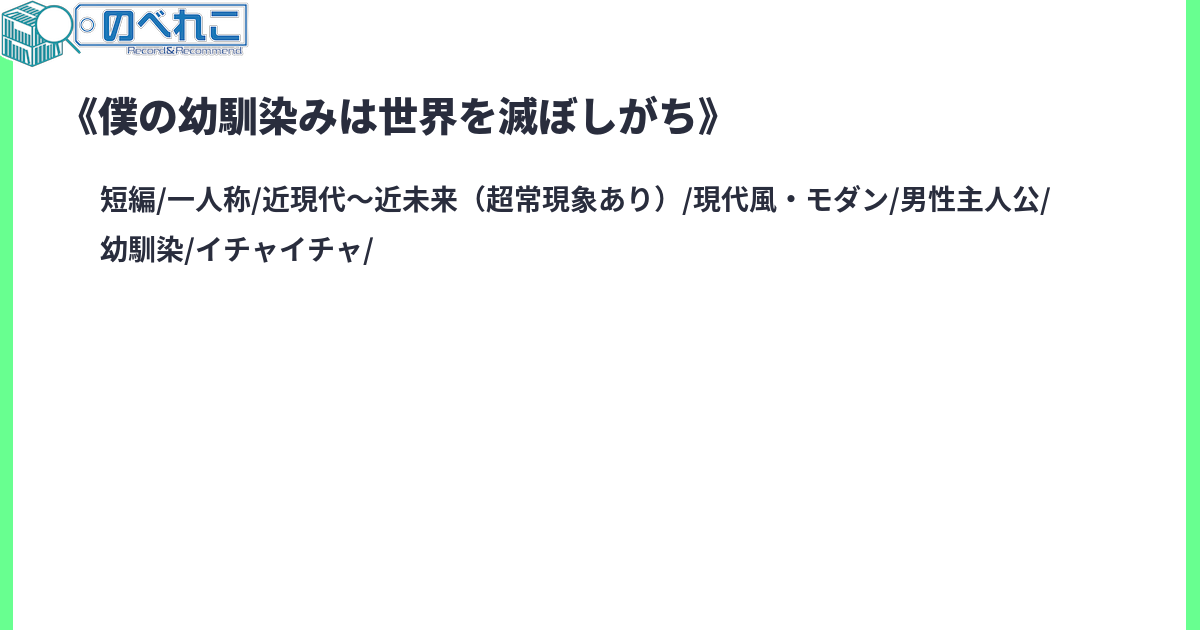 僕の幼馴染みは世界を滅ぼしがちである。だけど僕の前では世界を滅ぼさせない。サイトタグ:200文字短編 幼馴染み ラブラブ