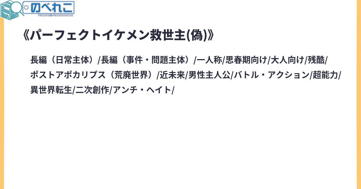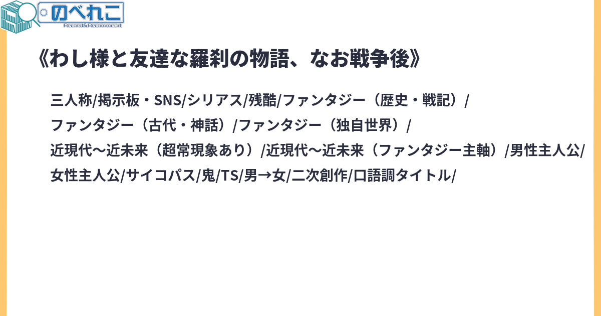 2025年4月26日土曜日、異世界に憑依転生していた少年は長年の時を経て遂に日本に帰還する……一人の相棒を引き連れて。大体"TSした元同性の親友"くらいの距離感の相棒に、魔法が使えるようになった少年することと言えば……当然! 漫画やアニメを布教して沼に叩き落とすことに決まっている!「あんたの魔法、漫画にパクられてんだけど!?」「五〇悟と両面〇儺とあんたってどっちが強いの?」「画面からシャルロットの声がする!?」「コイツプレイリストにラブソング無さそう」「本日のどうせこいつとくっつく枠はこの子ですか?」……果たして少年は、ちゃんと相棒をオタク沼に落とすことが出来るのでしょうか?※注意・ネットミームが含まれます・漫画、ゲーム、アニメ、声優、ボカロネタが含まれます・試験的な小説構成が含まれます・作者の捻れた性癖が含まれます・現実時間軸とある程度リンクしているのでリアタイ程楽しめます以上をご理解しなくてもいいのでご愛読して沼ってください。サイトタグ:異世界転移 男主人公 現代 魔法 日常 青春 ゲーム ラブコメ SF アニメ パロネタ 掲示板 コメディ 元異世界
