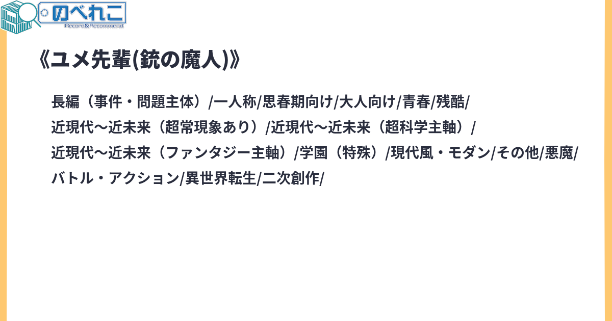 キヴォトスに出現した銃の悪魔が、ユメ先輩の身体を乗っ取って銃の魔人になった話です。ユメ先輩の実装は難しくても、別衣装としてならどうでしょうか。お気に入りや評価、感想いただけると、とても励みになります!よろしくお願いします!※ブルーアーカイブ、チェンソーマンのネタバレ注意です。※銃の悪魔は原作の描写が少ないので、作者の想像が大きいです。実質オリ主に近いかと思います。サイトタグ:ブルーアーカイブ ブルーアーカイブ チェンソーマン 梔子ユメ 小鳥遊ホシノ 銃の悪魔 独自解釈 独自設定 独自展開 ネタバレ注意 R-15 オリ主 残酷な描写 憑依 クロスオーバー