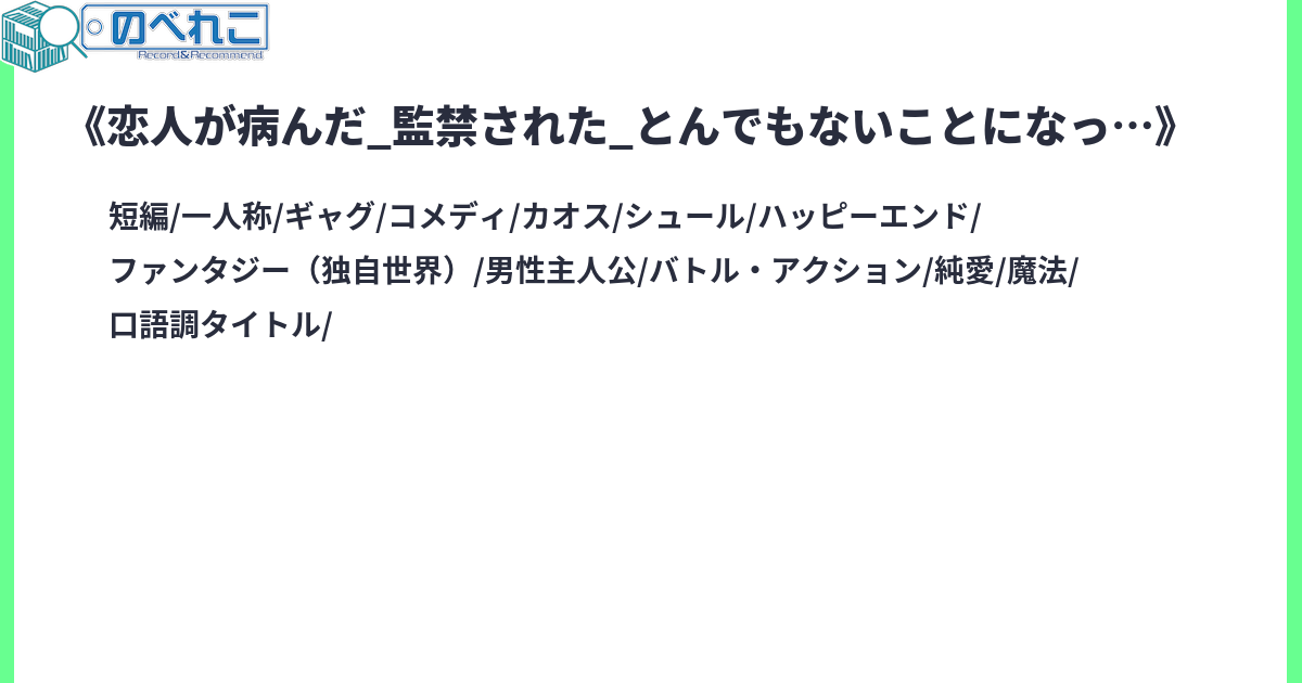 ジミーと申します。私事で恐縮ですが、魔女であり恋人であるバニーが病みました。で、僕は人気のない空間に監禁されました。バニー曰く「愛の巣」だそうです。永遠に閉じ込めて、二人だけの世界を作るんだそうです。嘘だと言ってよバニー。「治療させろ…」そこに不気味な声が響きました。白衣をまとい、聴診器を下げた職業不詳の人物が現れます。いや、本当は一目でお医者さんだと分かりました。だけど僕の常識が、彼を「医者」と呼ぶことを拒んだんです。「治療させろ なあ ヤンデレだ! 病んでいるのだろう⁉ なあヤンデレだろ おまえ」そう叫びながらメスを手にするお医者さん。それはメスと言うにはあまりにも大きすぎました。大きく分厚く重く、そして大雑把すぎました。それは正に鉄塊だったのです。サイトタグ:ギャグ ハッピーエンド 魔女 ヤンデレ 免許なき医師団 〇〇〇しないと出られない部屋 スクールラブ 医能バトル