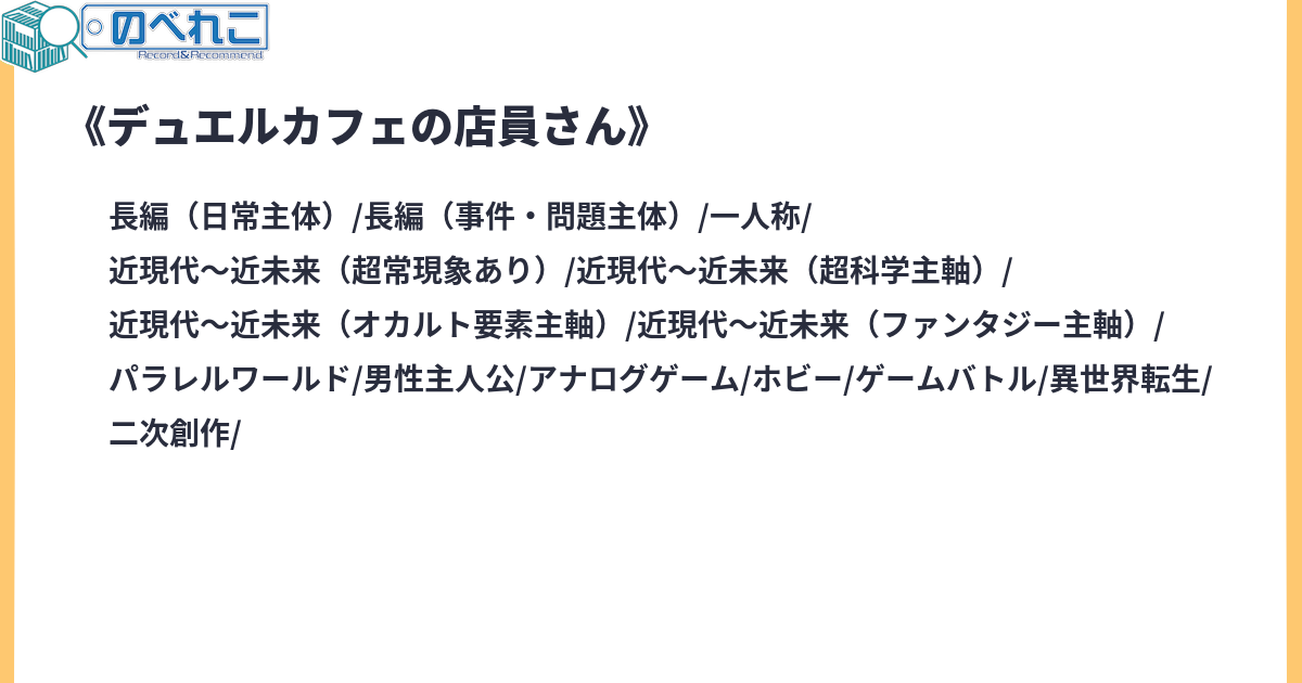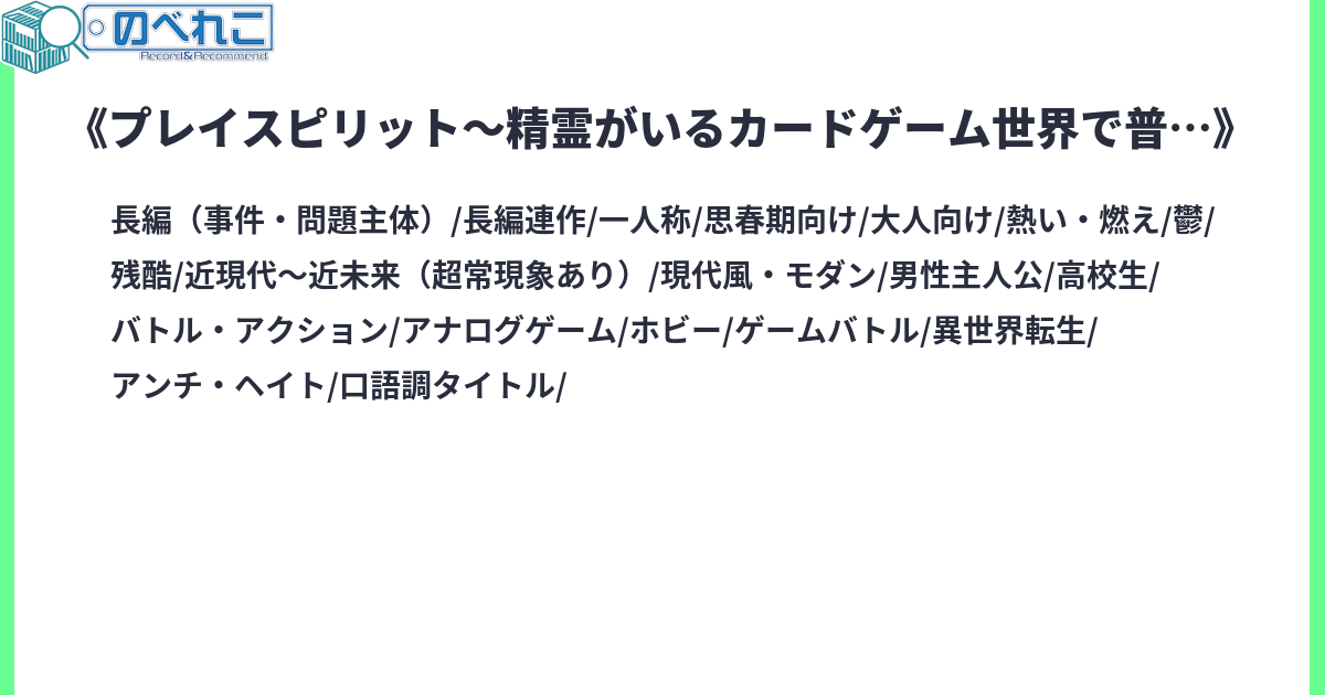 『プレイスピリット』略してプレスピというカードゲームがある世界。 そこはカードに精霊が宿るタイプのカードゲーム世界。 この世界では精霊の気まぐれや精霊との絆でご都合主義的な試合展開が起こることがある。 これは、そんな世界で精霊に頼らず精霊に左右されない普通のバトルがしたかった主人公がやさぐれたり巻き込まれたりしながらも頑張った話。サイトタグ:現代 日常 カードゲーム TCG 鬱要素注意 R-15 残酷な描写 アンチ・ヘイト 転生