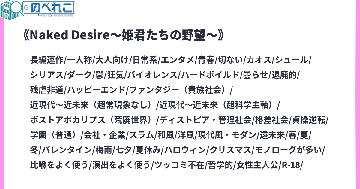 舞台は西暦2800年代。世界は政治、経済、そして文化のグローバル化並びにボーダーレス化が進み、従来の「国境「国家」という概念が意味をなさなくなっていた。数百年間にわたる争いの結果、世界は従来の国家から民族中心の国家に再編された。欧州大陸では、旧ドイツ、旧オーストリアなどゲルマン系民族の貴族層・上流階級は、旧ロシア、かつてのユーゴなど牛耳るスラブ系民族の経済実力者と共同戦線を締結し「神聖プレアガーツ=ホッフンヌング連邦帝国」を建国し、旧イギリスが中心の「北海・バルト連合王国」、旧フランスと旧スペインが中心となって建国した「ラテン帝国」と、欧州内で覇権争いをしていた。建国から400年近く経った「神聖プレアガーツ=ホッフンヌング連邦帝国」では、さまざまな制度矛盾が起きていたが、国内で起こる改革の動きは、そのつど利権を握る勢力によって潰されてきた。しかし改革を求める国民の声は次第に高まり、政府も貴族も、その動きをおさえられなくなってゆく。そんな中、貴族社会から「国民のための政府を作る」ことを企図する勢力が勃興し、徐々に力を持っていく。そしてその渦中にいたのは、とある姫君だった…以前書いていた小説を、大幅に改稿しました諸般の事情により、こちらには第二章から掲載します。それ以前の話はhttps://novel18.syosetu.com/n8218fn/からご覧くださいサイトタグ:SF 日常 残酷な描写あり シリアス ダーク 未来 群像劇 青春 宮廷 ベッドシーン 学園 シリアス ダークファンタジー ベッドシーン 宮廷 未来 学園 群像劇 R-18