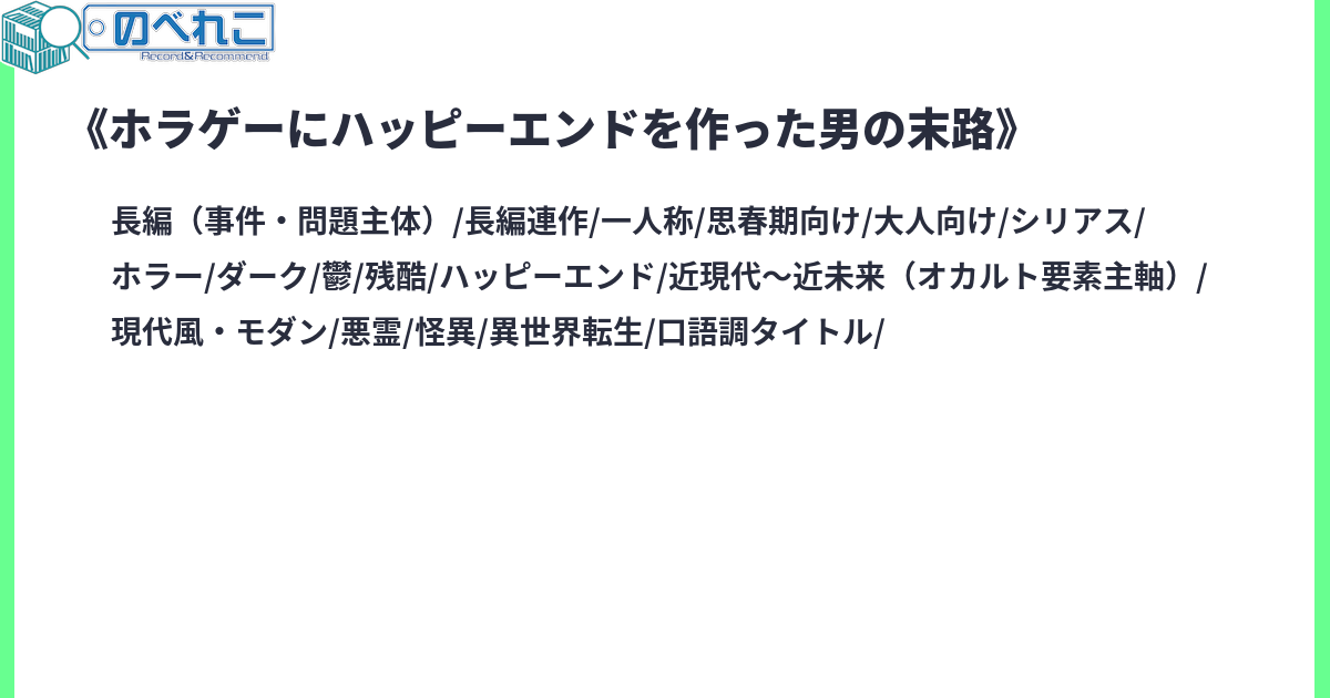 鬱要素の強いホラゲーに特殊な力を持って転生って、そんなのもうハッピーエンドを作るしかないじゃん。……いや、大丈夫だから。別に主人公たちを救った代償として俺が……とか、そんなんじゃないから。多少想定外だったけど、マジのガチのハッピーエンドだから。だからまぁ、安心して聞いていってくれよ。サイトタグ:現代 ホラー ヤンデレ 怪異 鬱要素 ハッピーエンド R-15 残酷な描写 転生