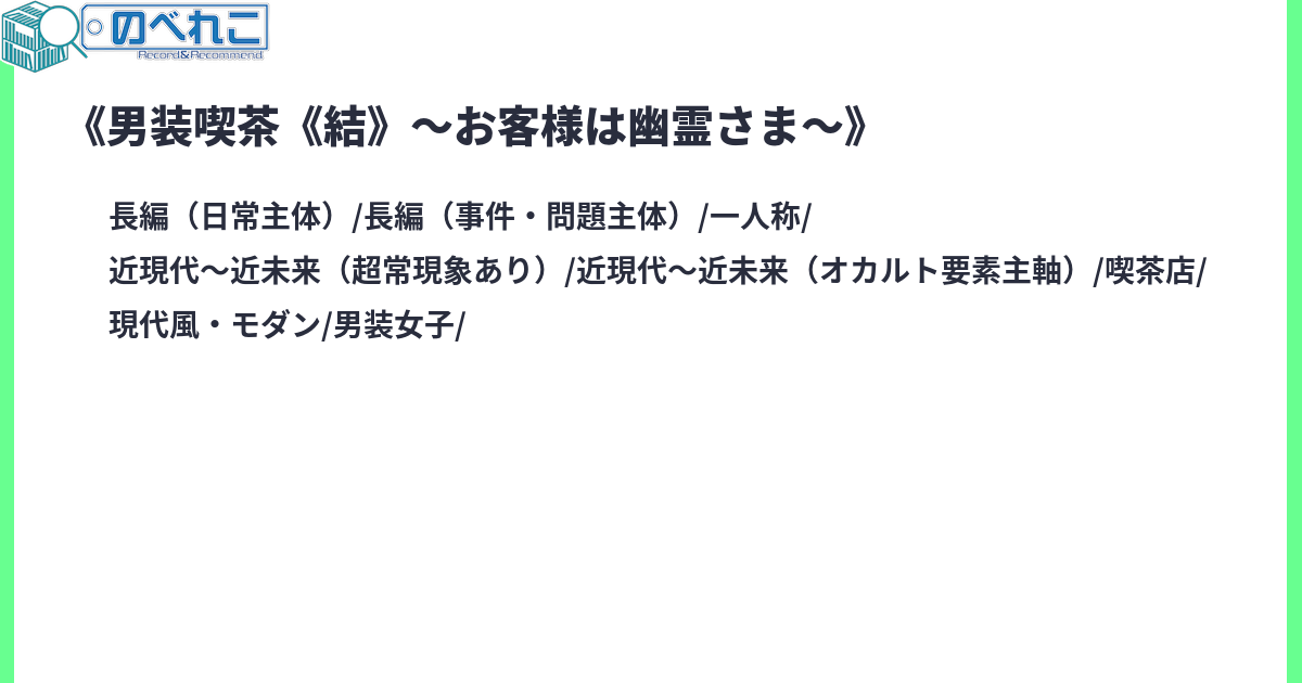 都会の片隅にひっそりと佇む男装喫茶《結》-ゆい-この店は、一見普通の喫茶店のように見えるが、その実態は、霊感を持つスタッフたちが運営する、幽霊向けの癒しの空間だった。店のスタッフは全員女性で、男装をして接客を行い、悩みを抱えた霊たちに安らぎと解放を提供している。主人公、ゆらは、普通の女子高生でありながら、霊感を持っている。ある日、ふとしたことから男装喫茶《結》に足を踏み入れる。店内では、幽霊たちが集まり、店員たちは彼らを癒す役割を担っている。店のスタッフたちが幽霊たちにどのように接し、心のわだかまりを解きほぐしていくのかを目の当たりにし、ゆらは次第にその世界に引き込まれていく。やがて、ゆら自身も霊たちに関わりながら、自分の内面を深く見つめることとなる。《結》で繰り広げられる不思議な出来事と、登場する幽霊たちとの交流を通じて、ゆらは人間としての成長を遂げ、そして自らの過去と向き合う。やがて、幽霊たちとともに解き放たれていくものがあり、店の秘密も明らかにされていく。霊感少女ゆらと、男装スタッフたちが織り成す、幽霊との癒しの物語。彼女たちの過去が解き明かされるとき、すべての謎が明かされる。サイトタグ:学園 男装 幽霊