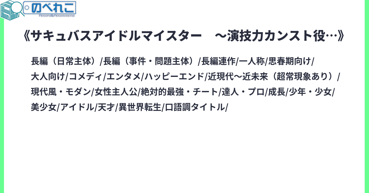 サキュバスアイドルマイスターというゲームがあった。サキュバスって付いてるんだからエロゲーだろというプレイヤーたちの期待を裏切り、概ね健全なアイドル育成ゲームだった。言うまでもなく名前詐欺との誹りを受けたが、実際にプレイした者たちからは好評。え? そんなに良いの? そんな名前で? ならやってみるか……………………俺はこの子をトップアイドルにしてみせる! そんな人々が量産された。サキュバスアイドルマイスターはソーシャルゲームである。群雄割拠のアイドルソシャゲの一つであり――既にサービス終了したゲームである。そんなサキュバスアイドルマイスターの世界に美少女として転生した。なら、やることは決まってるよな? 不遇だった推しをトップアイドルにしてみせる。そのためには俺もトップアイドルにならなきゃいけない。推しを引っ張り上げるだけの力は欲しい。ってことで、最初は子役から始めようと思います。サイトタグ:現代 コメディ ゲーム世界転生 子役 役者 芸能 アイドル 主人公最強 サキュバス(サキュバスではない) ハッピーエンド R-15 転生
