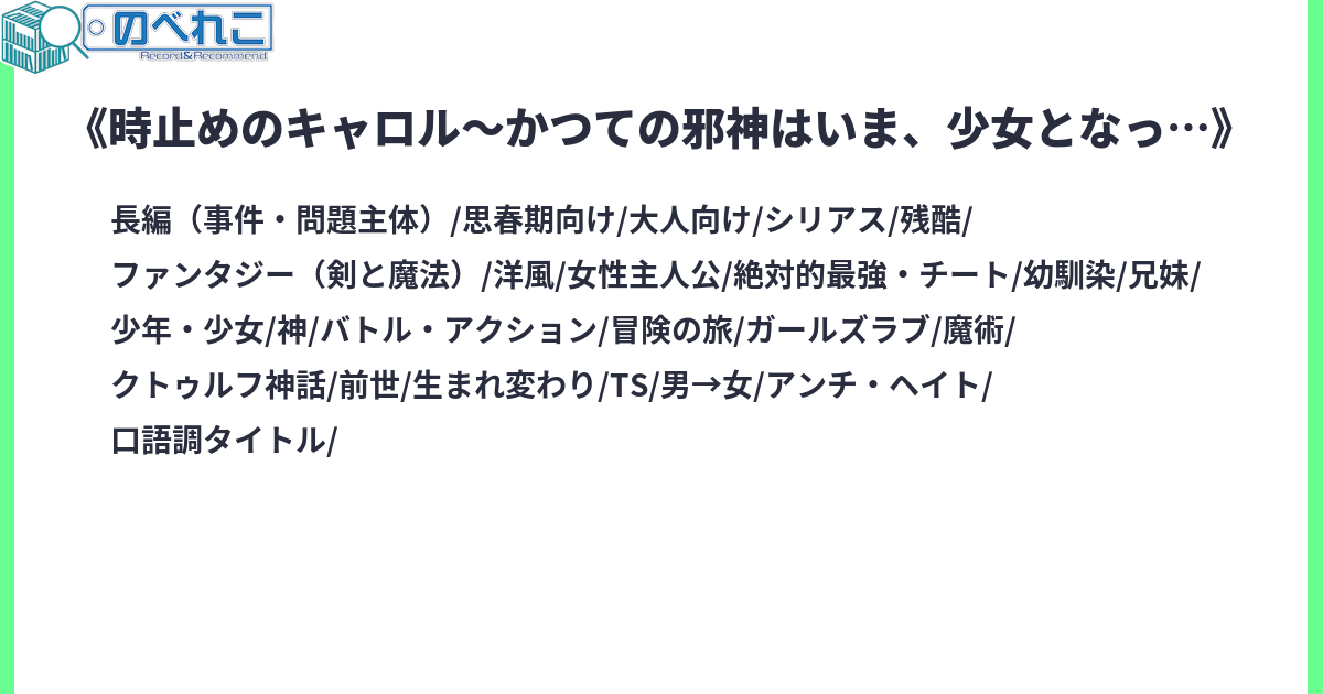 かつて時間停止の魔術を用いて邪神同士による大戦を制した最凶の邪神・ゾアは、遠い未来で人間の少女・キャロルとして転生を果たす。前世では実感することができなかった本物の「自由」を追い求め、キャロルは邪神の力を宿しながらも一介の魔術師として日々を生きていく。ヒトであり邪神。邪神でありヒト。最凶の邪神は、最凶の少女となって魔術を振るう。サイトタグ:ファンタジー 冒険・バトル TS バトル 主人公最強 人外 女主人公 クトゥルフ神話 R-15 ガールズラブ オリ主 残酷な描写 アンチ・ヘイト 転生 性転換