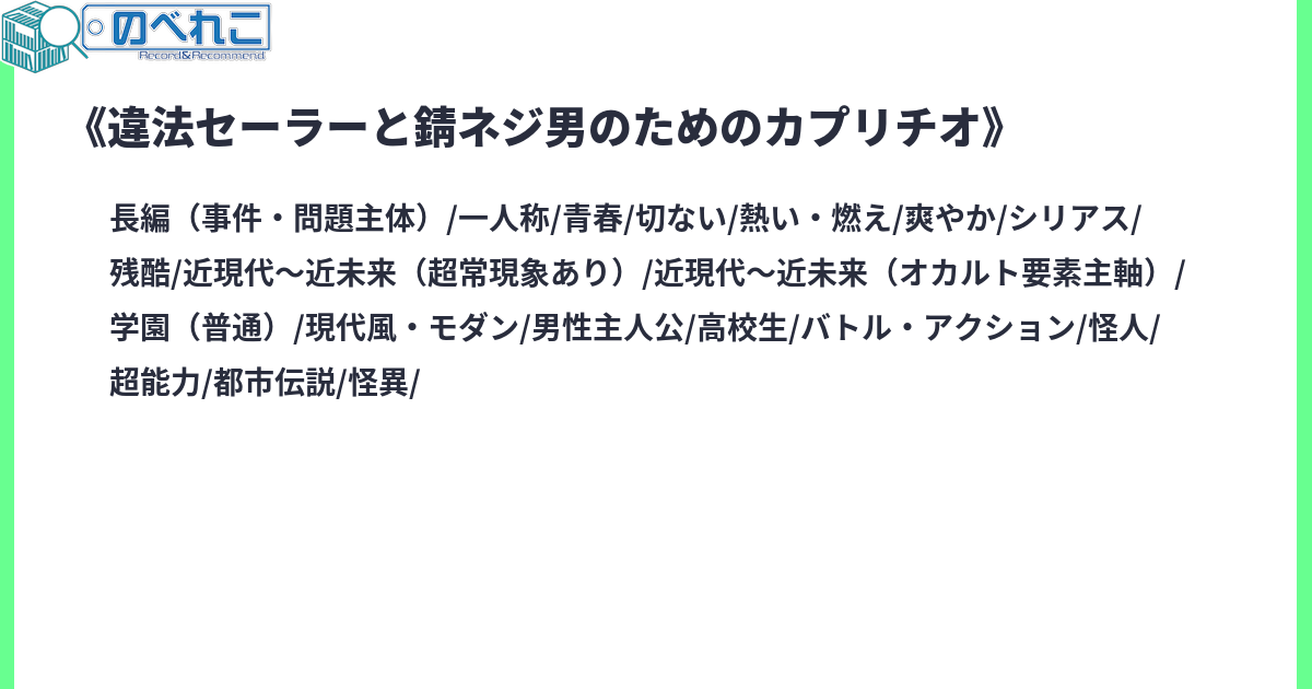 夜の路地裏で鉄芯入り竹刀を振り回す謎の「違法セーラー」に遭遇した赤髪高校生・燕子花 海輝《かきつばた かいき》。違法セーラーが追うのは、頭に穴を開ける「連続穿頭事件」の犯人「錆ネジ男」――赤錆をまき散らし、他人の頭の「ネジ」を外して回る不気味な怪人。錆ネジ男と違法セーラーの戦いに巻き込まれた燕子花は、成り行きから錆ネジ男について追うことになる。その怪人が、自分の運命に大きく絡んでいることも知らずに。11/23の文学フリマ東京41で発刊される「新青春エンタアンソロジー【アルゲントゥム】」に寄せる予定だった原稿です。アルゲントゥムには関連する別の作品を書き下ろしているので、そちらも要チェック!!https://novereco.booth.pm/items/7555895サイトタグ:新伝綺 怪人 セーラー服 異能 新青春エンタ 年上ヒロイン 都市伝説