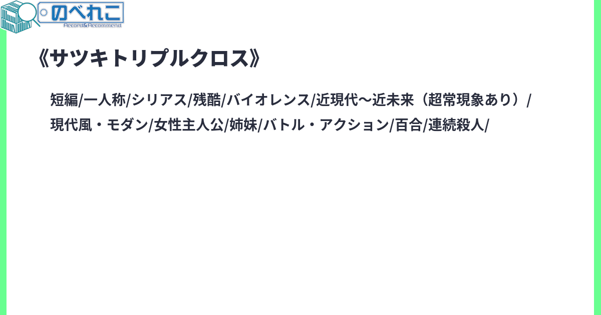 サツキは美しき姉を狂的に溺愛しているだけの、どこにでもいる普通の少女である。ある日、その姉が誘拐された。サツキの手により誘拐犯が殺された事で事件は解決したが、美しき姉はそれ以降、部屋に引きこもるようになってしまった。 事件から半年が経った頃、エセ関西弁のスーツの女性、ギンジが現れる。彼女との出会いを切欠に、サツキは半年前の事件の真実を知ってしまう。サイトタグ:姉妹 誘拐 妹 姉 エセ関西弁 百合 バトル