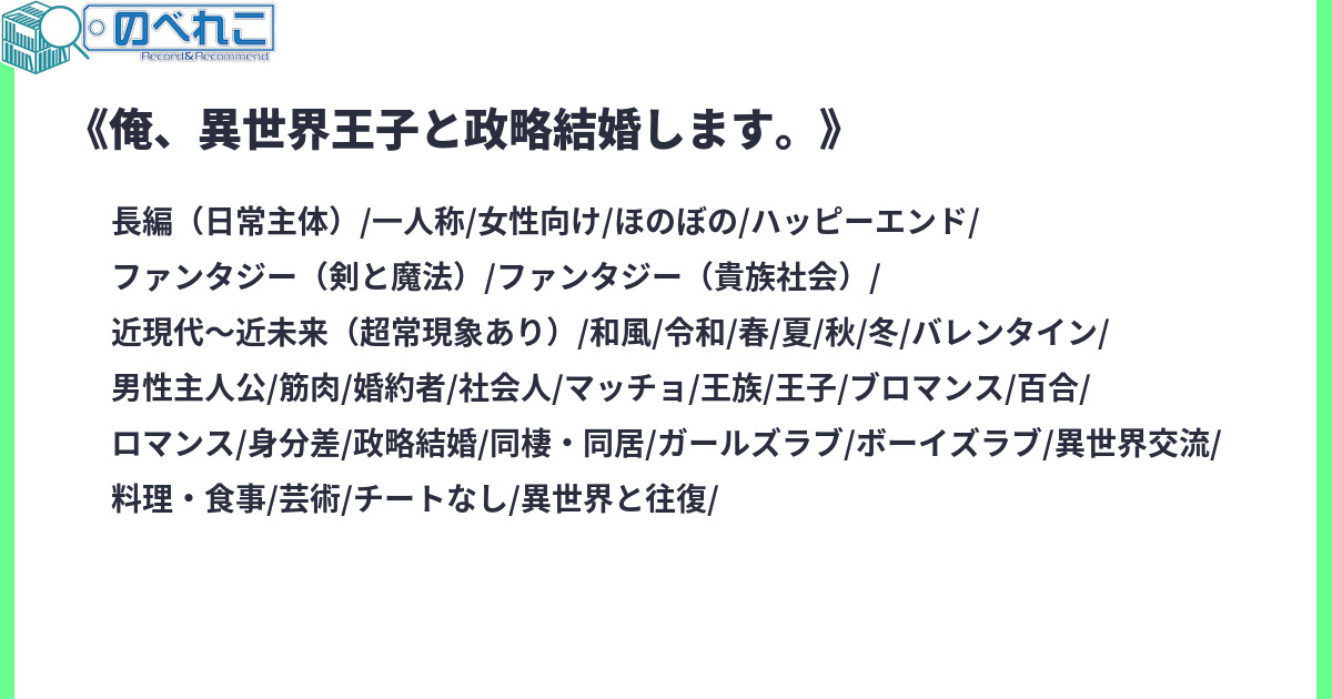 第2回ルビーファンタジーBL小説大賞投稿作品。年下金髪碧眼イケメン王子×年上アラサーガチムチ元アスリート現リーマンあらすじ(ネタバレあり)2000年代、つくば市内の大学の研究所で事故が起きて研究室と異世界にあるサルドビア王国王宮の物置部屋がつながってしまう。それから10年経ち、日本とサルドビアの国交樹立が決定。それに伴って両国の繋がりを強化するため政略結婚相手を選ぶパーティを行われることに。相手国からはまだ18歳の第4王女・アリシアと第5王子・アドルフの双子が選ばれる。当初は皇族との結婚を検討するも皇室に年齢の釣り合いの取れる相手がいなかった事から、18歳以上30歳以下で政府与党関係者の血縁者が結婚相手候補としてパーティに招かれることになった。膝を壊して社会人ラグビーを引退し社業に専念するも、ラグビーのない日々に退屈さを感じていた主人公の何松幸也(なにまつゆきなり)は日本政府の首相補佐官で政治家の父に誘われ、アドルフ王子とアリシア王女の結婚相手を探すお見合いパーティに参加。パーティー会場で初めてアドルフ王子と出会うと何故か気に入られて結婚することに。結婚による新生活に準備に追われつつも日々ちょっとした交流を持ち、春の迎えとともに幸也はアドルフ王子と再会しサルドビアでの結婚式を迎える。挙式後に初夜の儀式を執り行おうとするも、政治的な都合による結婚であることから関係を持つのを延期することに。挙式後、2人は両国の外交拠点も兼ねたつくば市内の大きめの邸宅で暮らすこと。夏に差し掛かると、2人は友好親善のため近隣施設の訪問や国内外首脳閣僚クラスとの会談やパーティーへ招待されるように。アドルフ王子の配偶者として同席する中で少しづつ互いの関係を深めていく。秋の終わりになると、何か思うところあってか不安定になり始めたアドルフに寄り添う幸也。その中で婚約者・ロザリンドとの死別トラウマや同性との結婚を父に命じられていた事を明かされ、自分より先立たなさそうな男性として幸也が選ばれたことを知りモヤモヤとしながら冬を迎える。冬、クリスマスやバレンタインなどの定番恋愛イベントを祝ったり、実家への帰省などを通じて幸也は両思いの可能性に気づく。そして2月、恋人の日に改めて気持ちを通い合わせた2人は初夜の儀をやり直そうと約束。そして再びの春、2人は肉体的に結ばれる。精神的にも肉体的にも結ばれ合った2人は、これからも二つの世界を繋ぐ人生を歩いていくことを誓い合った。サイトタグ:カクヨムオンリー BL ボーイズラブ ファンタジー 政略結婚 年の差 年下×年上