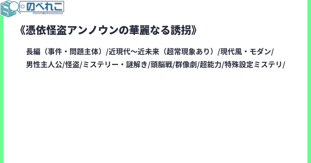 自由と混沌と美を愛し、束縛と秩序と醜悪を嫌う、憑依怪盗アンノウン。 彼が今回、請け負った依頼は、さる名家の令嬢を盗み出すことだった。 異能『読心』を持つ少女フィデリス、異能『変身』を持つ少年バステトと共に、アンノウンは華麗なる誘拐計画を始める。 一方、時を同じくして犯罪組織〈兵隊〉も暗躍していた。 あらゆる幸運を呼び寄せる宝玉『賢者の石』を手に入れるため、彼らはアンノウン一味を利用しようと画策する――。⚠本作品は、法律・法令に反する行為を容認・推奨するものではありません。⚠本作品の応援コメント欄では、皆様の自由な推理を大歓迎しております。 そのため、他の方の推理を読みたくない読者様は、応援コメント欄を開かないことを推奨いたします。※本作品は熟慮の末、「現代アクション・異能バトル部門」ではなく「エンタメ総合部門」に応募しています。本作品におけるアクション描写及び異能バトル要素は、特殊設定ミステリを成り立たせるための表面的な構成要素(表現手法)に過ぎません。そのため、「ミステリー(総合エンタメ)」こそが最も本質的なメイン要素であり、「現代アクション・異能バトル部門」に応募する方が(そのジャンルの読者をメインターゲットとしていないため)却って不適切であるという判断に至りました。※AIは「完成済みの本文に対する感想を出力させる」手法でのみ、使用しています。AIからのフィードバックを間接的な参考にして若干の変更を施した部分もございますので「AI補助利用」のタグを付けておりますが、「設定・構成・本文執筆・校正」においては、いずれもAIを使用しておりません。サイトタグ:ミステリー 特殊設定ミステリ 怪盗 頭脳戦 群像劇 謎解き要素 関係性 AI補助利用