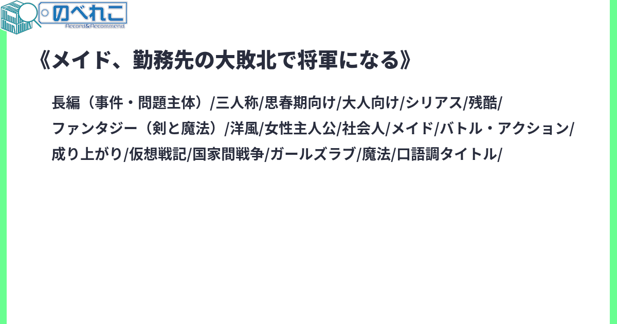 没落貴族のゼフォルは運よく最高位貴族であるウィルベート公爵家でメイドとして働いていた。しかし仕事はつまらなく退屈な日々を送っていた。だがまさかの勤め先が戦争で大敗北、当主は討ち死に、主だった家臣も戦死か逃げ出す始末。巻き込まれたらかなわんと逃げようとするゼフォルだが唯一残った主である公爵家の不義の子エスメルに将軍になりなさいと言われ残った敗残兵を率いる羽目になってしまう。とんでもない無茶ぶりに絶望するゼフォル……ではなくようやくやりたいことができると嬉々として兵を率いるのだった。サイトタグ:ファンタジー 戦記 女主人公 メイド 成り上がり R-15 ガールズラブ 残酷な描写