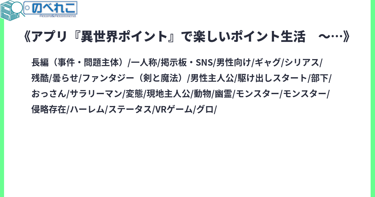 仕事を終え、主人公が日課のソシャゲを終えると、スマホには見覚えのないアプリがダウンロードされていた。そのアプリの名は『異世界ポイント』。どうやらこのアプリ内で得たポイントは現実世界でお金や様々な特典に交換出来るらしい。これは不思議なアプリを手に入れた主人公がお金を稼ぎながら、現実と異世界を変えてゆく物語サイトタグ:男主人公 探索 掲示板 モフモフ まず服を脱ぎます