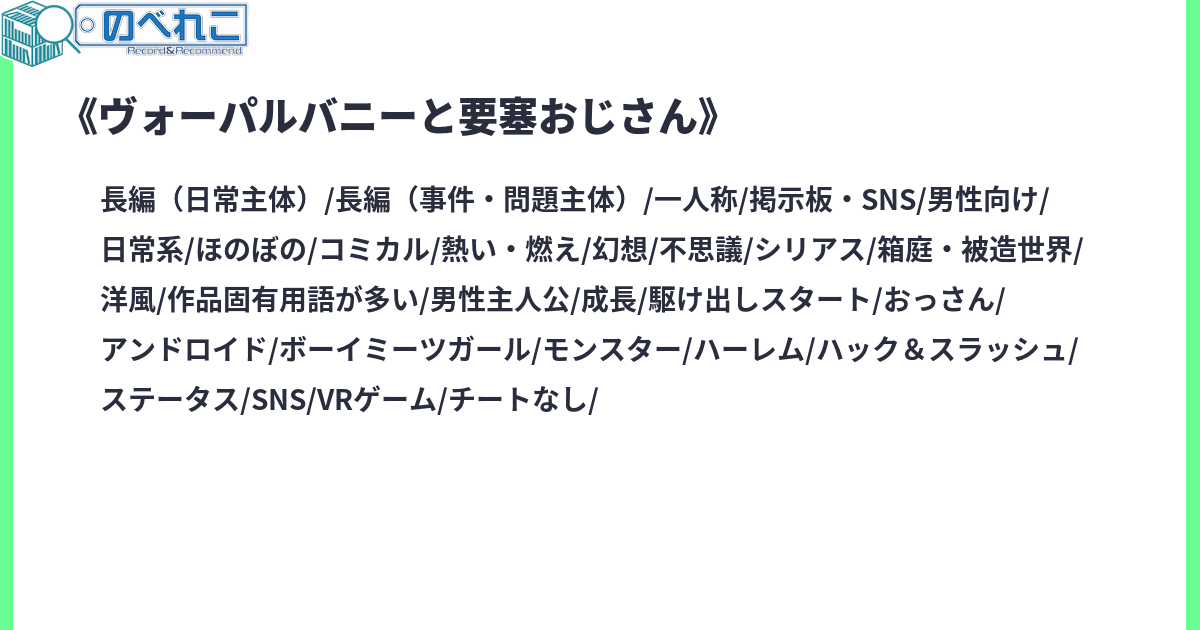毎日19:00に更新中!趣味に生きるおじさんレッジは新作VRMMOに手を出した。機械人形として未開の惑星へと降り立った彼は、さっそく攻略そっちのけで脇道へ走りはじめる。なのに趣味要素だと思われていたスキルも気が付けば……。ニッチを攻める変わり者なおじさんが出会うのは、物理で殴ればだいたい解決と息巻くウサミミ少女やミニマルクールな女の子、盾格闘家のお姉さん、サムライガールにニンジャボーイ。個性豊かな仲間たちに囲まれて、彼は今日も自由気ままに星を征く!◇カクヨム様にも同時連載しております。2020/07/14に一度休載しました。2020/06/13第1章完結。2020/07/07第2章完結。2020/07/25第3章完結。2020/08/23第4章完結。2020/10/12第5章完結。2020/12/24第6章完結。2021/02/25第7章完結。2021/04/11第8章完結。2021/06/08第9章完結。2021/07/19第10章完結。2021/08/28第11章完結。2021/09/16第12章完結。2021/10/24第13章完結。2021/12/07第14章完結。2022/01/13第15章完結。2022/01/31第16章完結。2022/02/23第17章完結。2022/04/13第18章完結。2022/05/26第19章完結。2022/07/25第20章完結。2022/07/31第21章完結。2022/09/28第22章完結。2022/11/27第23章完結。2023/02/05第24章完。2023/04/30第25章完。2023/06/15第26章完結。2023/07/23第27章完結。2023/10/14第28章完結。2023/12/15第29章完結。2024/03/23第30章完結。2024/04/17第31章完結。2024/06/20第32章完結。2024/10/22第33章完結。2024/12/13 第34章完結。2025/02/24 第35章完結。2025/04/15 第36章完結。サイトタグ:VRMMO アンドロイド ほのぼの 主人公脇役 ウサミミ おっさん ハーレム