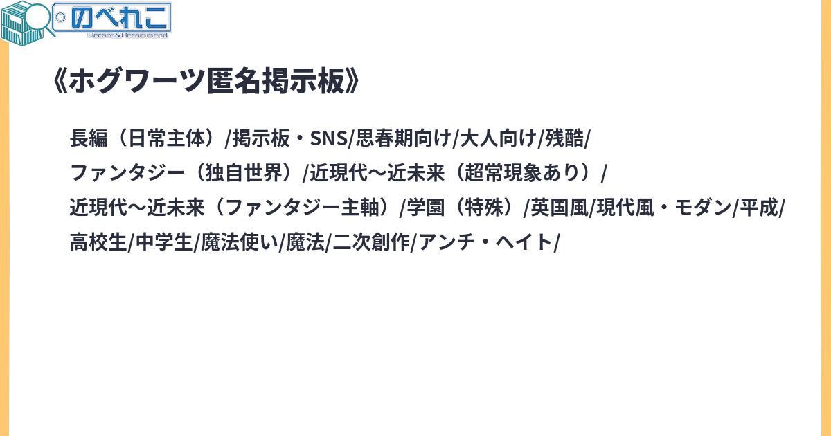 マホウトコロからやってきた留学生が、ホグワーツに掲示板機能のある魔法道具を持ち込んでホグワーツ生と色々交流する話。内容は主に・日本魔法界とイギリス魔法界の違い・原作で描写されなかった魔法の詳細(捏造)、学術的見地・日本魔法界のやばいところ(神様、術、歴史 他色々)・原作で描写されなかったマグルの国際情勢における魔法界のあり方・他国の魔法界の行動・来る大インターネット時代への備え・魔法史とマグルの歴史をあわせた総合史・共同での魔法研究など。初め数話はホグワーツ生も慣れてないので話し方がお硬いところはありますが、後々砕けて来ます。また時代的にネットスラングが出来てない時代ので現在のスラングのうち明らかに元ネタが新しいものは出てきません。(淫夢とか)作者の知識は10年前に読んだ原作と10年前に見た映画シリーズと最近読んだ二次創作と最近プレイしてるホグワーツレガシーです。呪いの子とかスマホのゲームとか細かい部分については無知無知です。ウィキ調べたり都合よく無視して捏造したりしてます。サイトタグ:ハリー・ポッター クロスオーバーは念の為 掲示板 掲示板形式 政治 経済 技術 独自解釈 オリジナル設定 捏造 原作改変 R-15 オリ主 残酷な描写 アンチ・ヘイト 転生 クロスオーバー